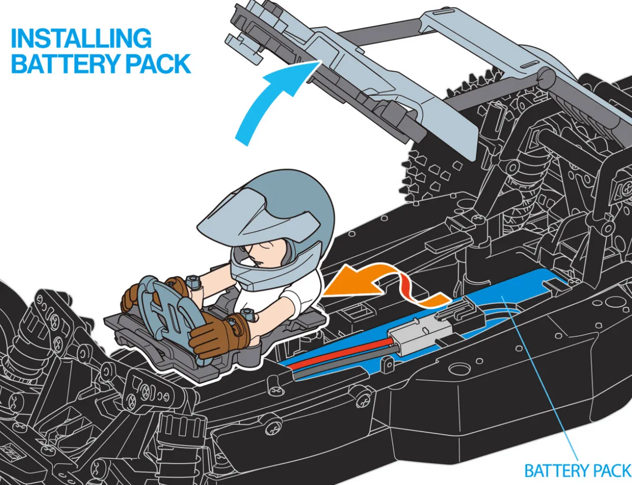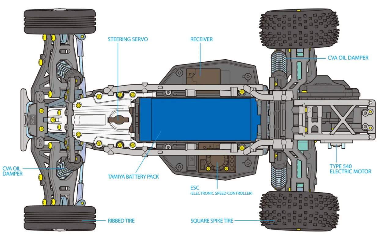 - Battery: 6-cell flat with standard Tamiya connector