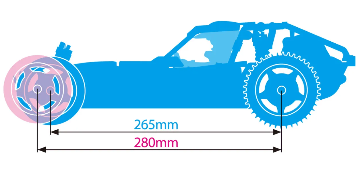 - Two wheelbases can be selected: 265mm for emphasis on handling or 280mm for emphasis on stability. Reassemble the front section (arms, etc.) to switch between two different wheelbases.