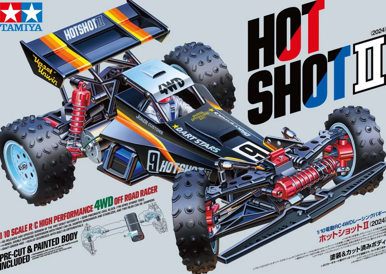 Tamiya welcomes a re-released and updated version of the 4WD buggy Hotshot II, the original of which was first released in 1987, following Tamiya’s first 4WD buggy Item 58047 Hotshot released in 1985 and Item 58054 Supershot released in 1986.