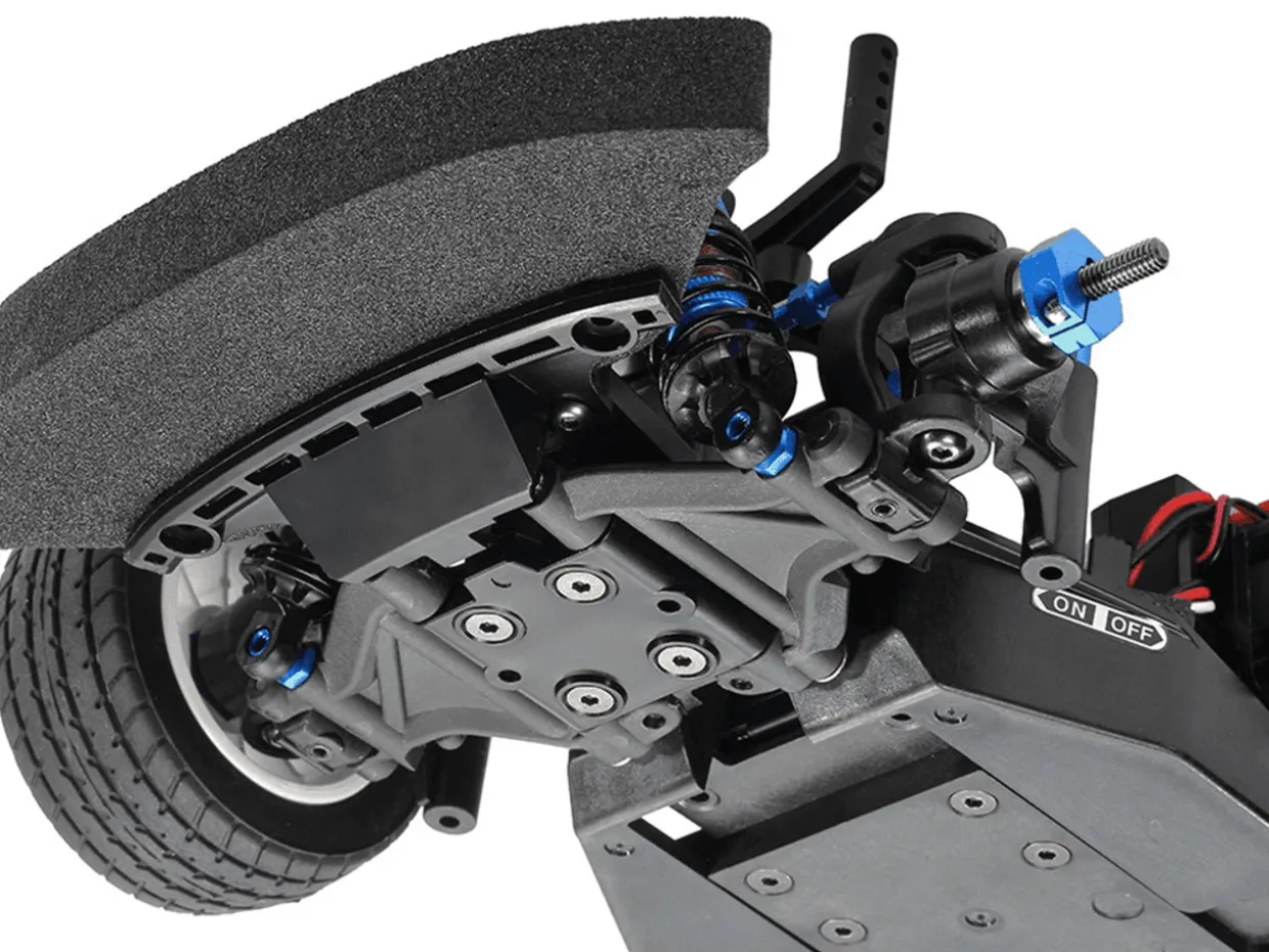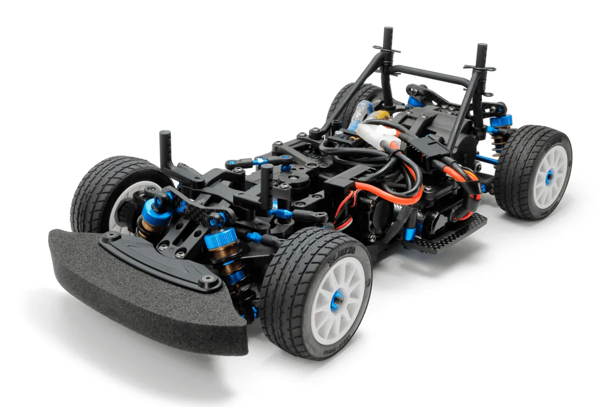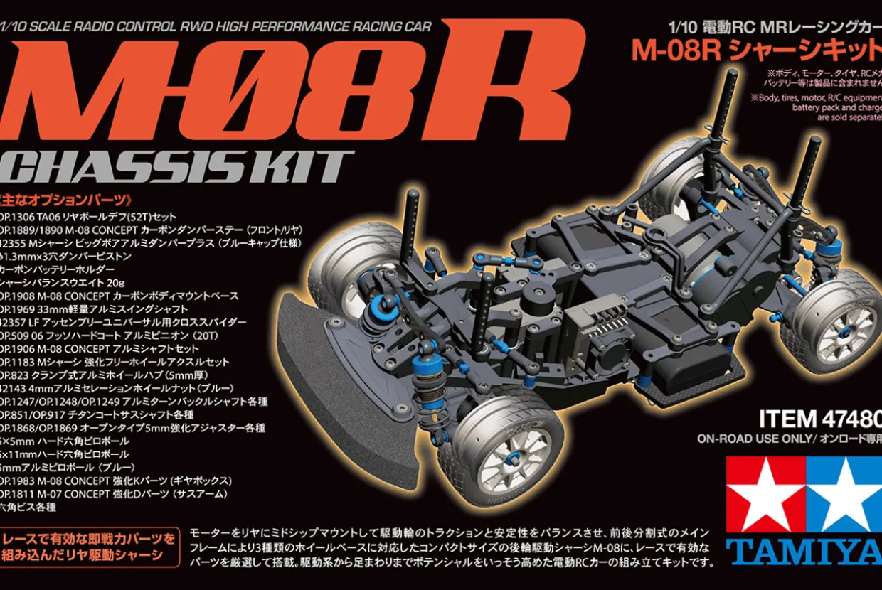 The M-08R Chassis Kit from our great range of radio controlled cars – The M-08R adds a plethora of race-spec parts to the balanced, compact RWD M-08 Concept chassis: an example being the hopped-up drivetrain with a ball differential, universal shafts featuring low-friction cross joints and lightweight aluminium swing shafts, plus 5mm wheel hubs. Turnbuckle shaft suspension arm and steering setup components simplify fine-tuning of the M-08R, and titanium-coated shafts are a durable inclusion in the kit. Carbon fibre damper stays are paired with M-Chassis big bore aluminium dampers+ featuring dedicated blue anodized top and bottom caps for a touch of class, while a 20-gram ballast weight is included to get the chassis feeling just how you want it to.