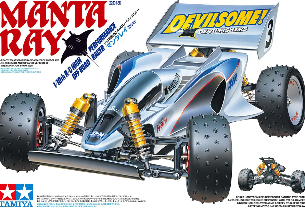 This R/C car made a name for itself when it was originally released in 1990 for being popular as both a beginner-level off-road buggy and an easily upgradeable car for veteran radio control hobbyists. The body is inspired by the sleek curved shape of Manta Rays and is made from lightweight and durable polycarbonate. Downforce is provided by the large rear wing and traction is provided with all-terrain spike tires mounted on dish wheels to provide excellent handling on any surface.