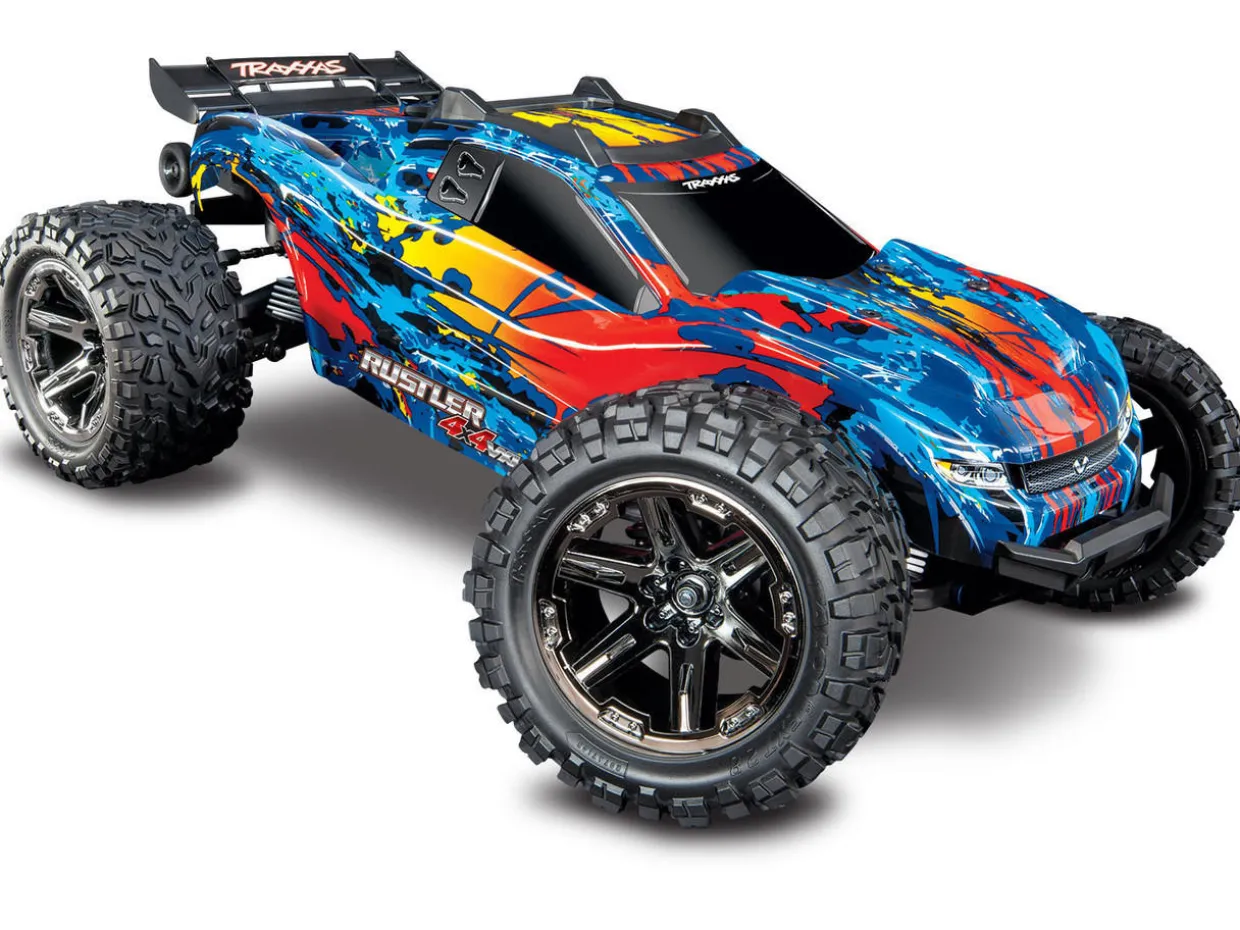 The Traxxas Rustler 4X4 VXL from our great range of radio controlled buggies, is a hard-charging wheelie machine that captures the speed and classic style of the number-one-selling Rustler and injects it with brutal 4-wheel drive performance, increased durability, and even more fun! Bury the throttle and the Rustler 4X4 launches its front wheels skyward as it shreds the ground underneath.