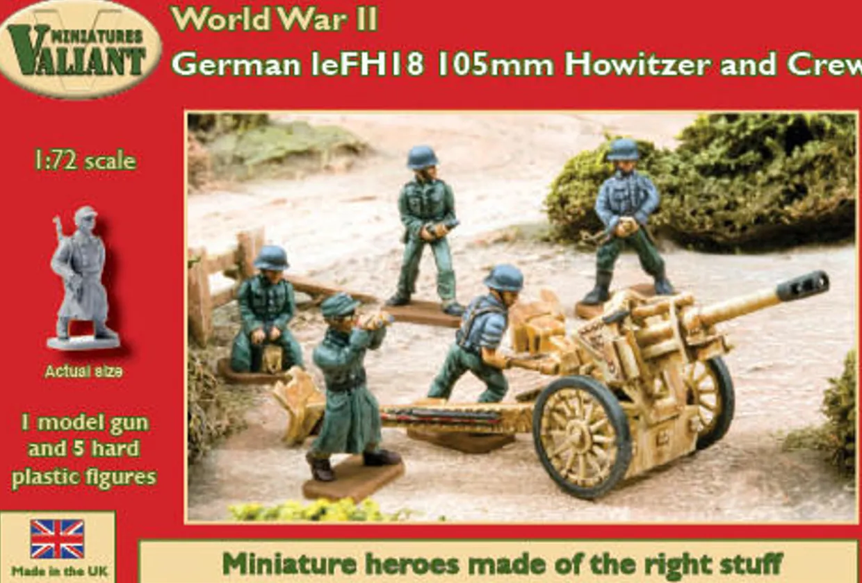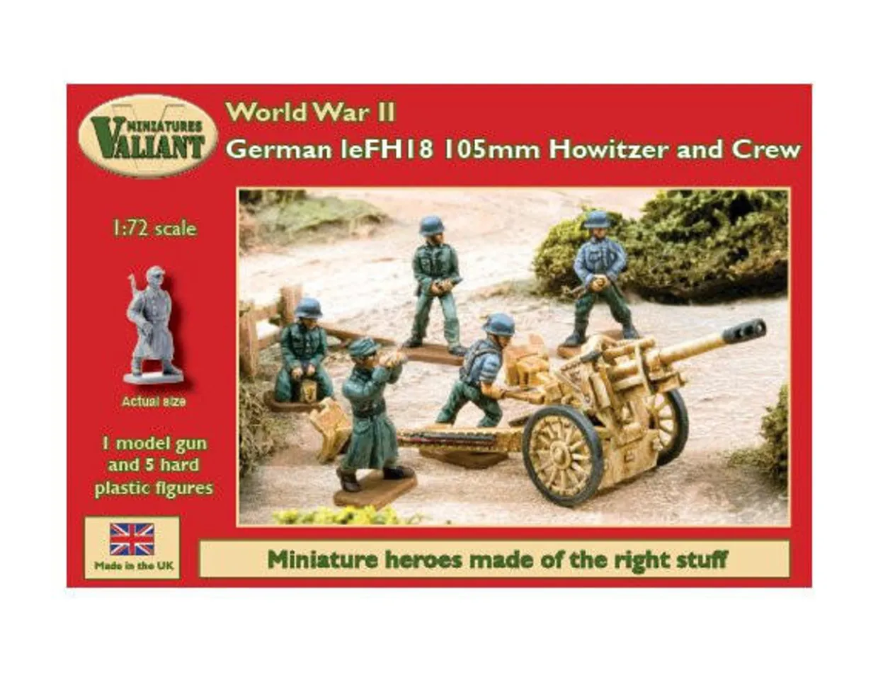 The Valiant Miniatures 1/72 German LeFH18 105mm Howitzer and Crew from our 1/72 and 1/76 scale figure model kits range accurately recreates the real-life German artillery from World War II.