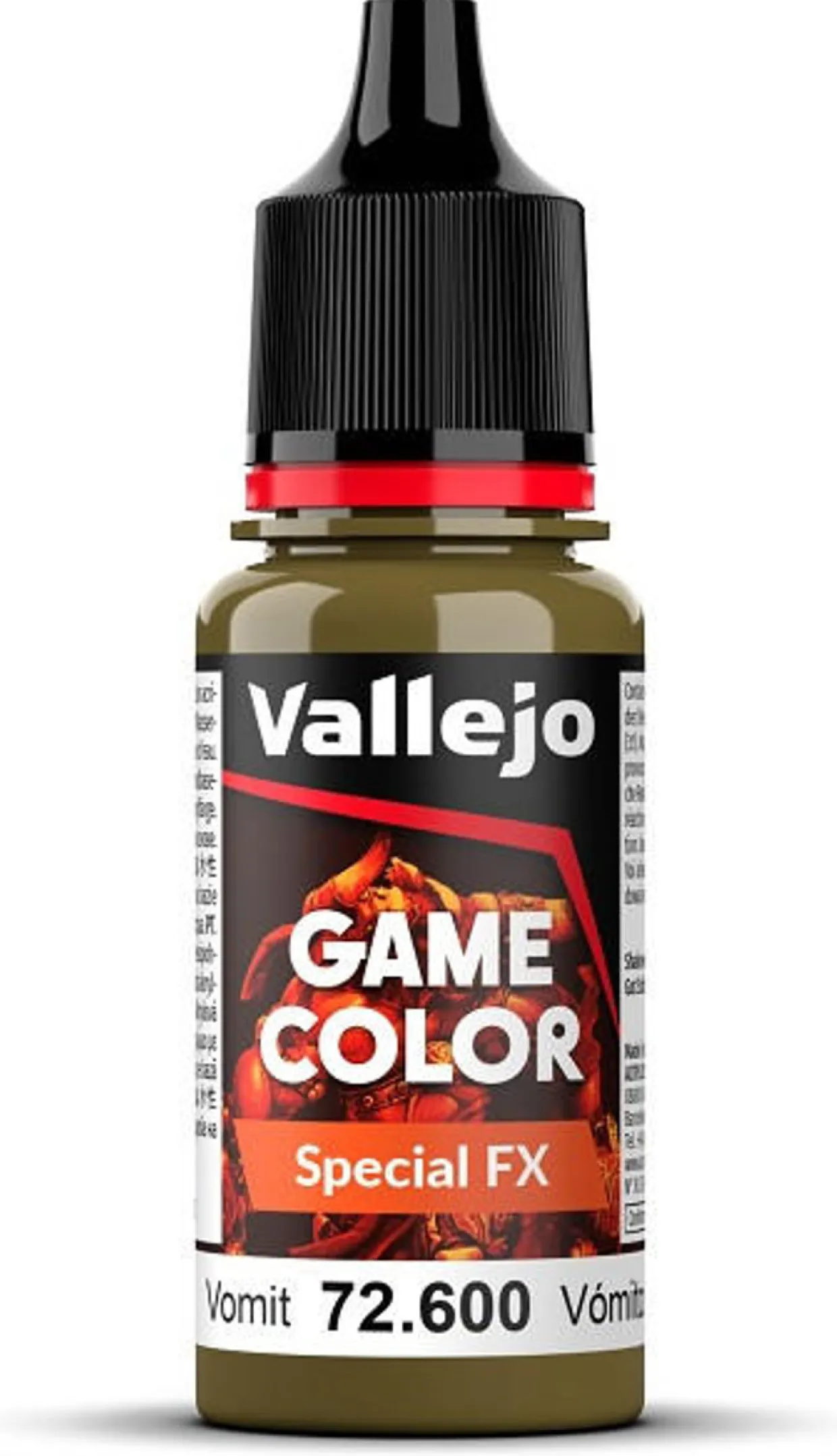 Vallejo 18ml Special FX 600 Vomit. Acrylics colors in a matt and opaque, water based formula, especially designed for brush-on use. Each color has been meticulously developed in collaboration with model-painters who specialize in fantasy figures and dioramas.