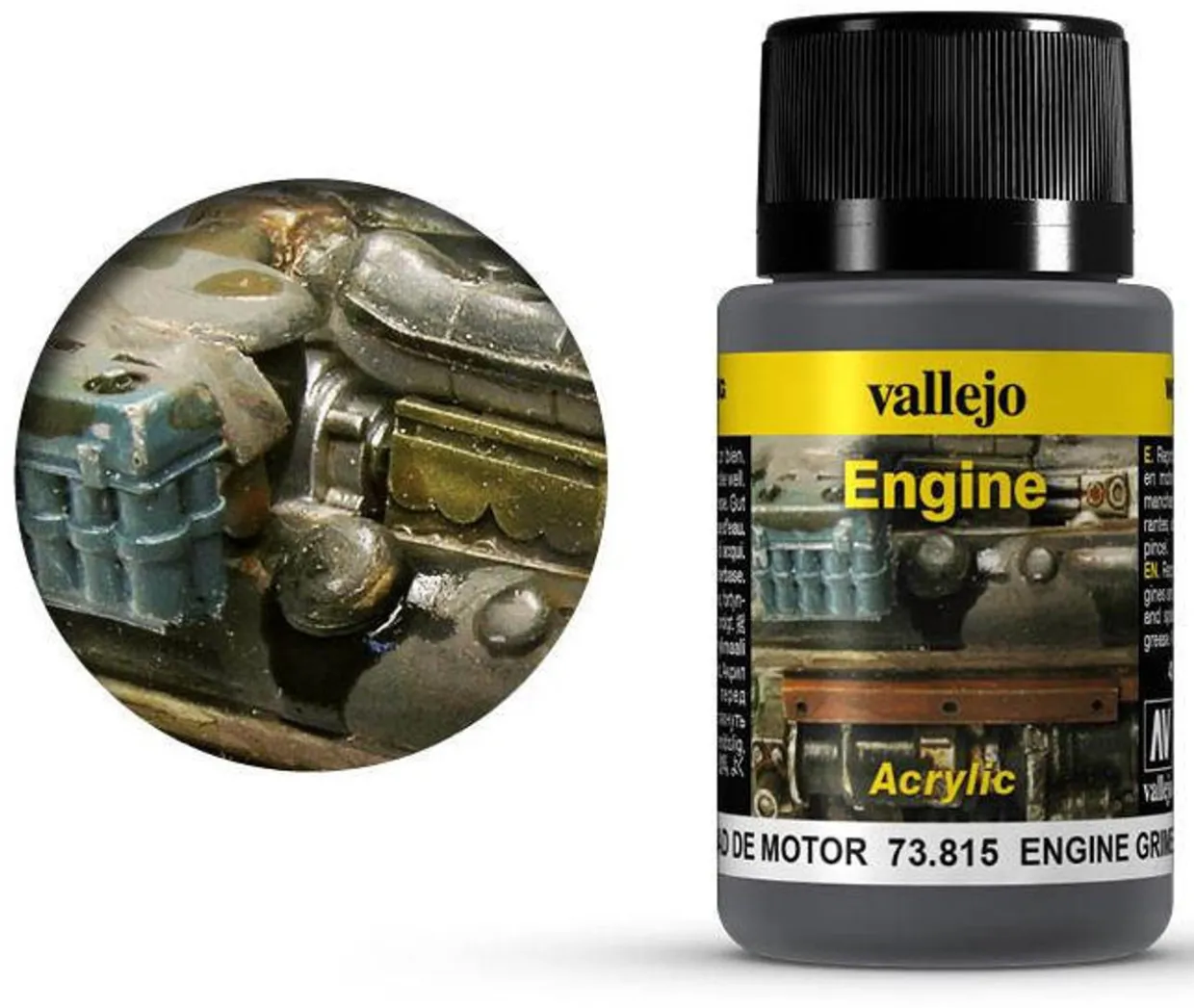 Vallejo Acrylic Weathering Effects 40ml Engine Grime. The innovative range of Weathering Effects offers the modeler a new medium for depicting the effects of exposure to weather and extreme climates on vehicles and armor.