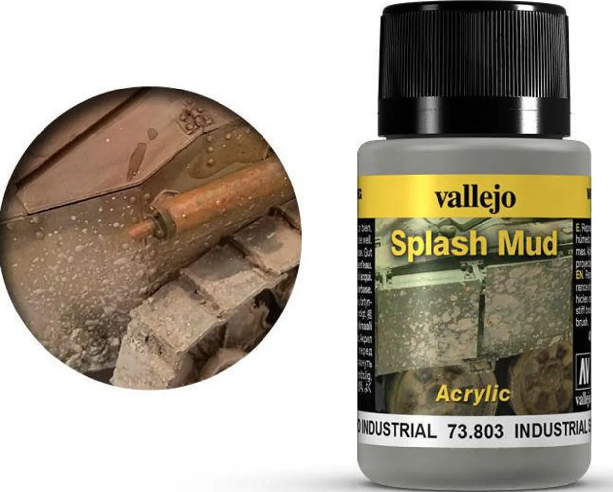 Vallejo Acrylic 40ml Industrial Splash Mud. The innovative range of Weathering Effects offers the modeler a new medium for depicting the effects of exposure to weather and extreme climates on vehicles and armor.