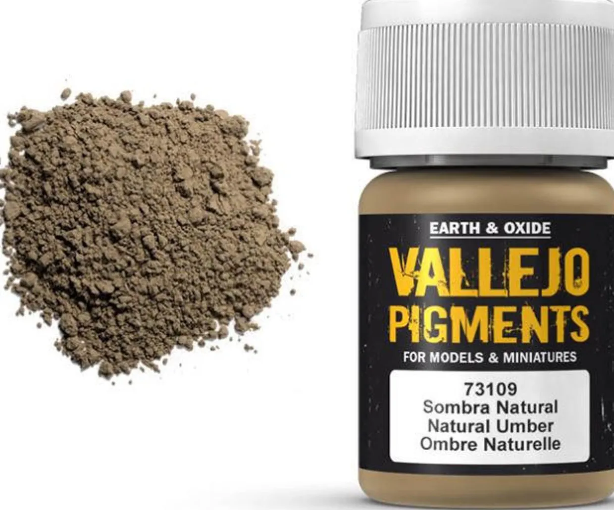 Vallejo Pigments Natural Umber. The Vallejo Pigments, a selection of natural earth and synthetic pigments, have been chosen for their permanence, their excellent light fastness, and for the extra fine milling of their particles, which facilitates the mixtures and their application on models and dioramas.