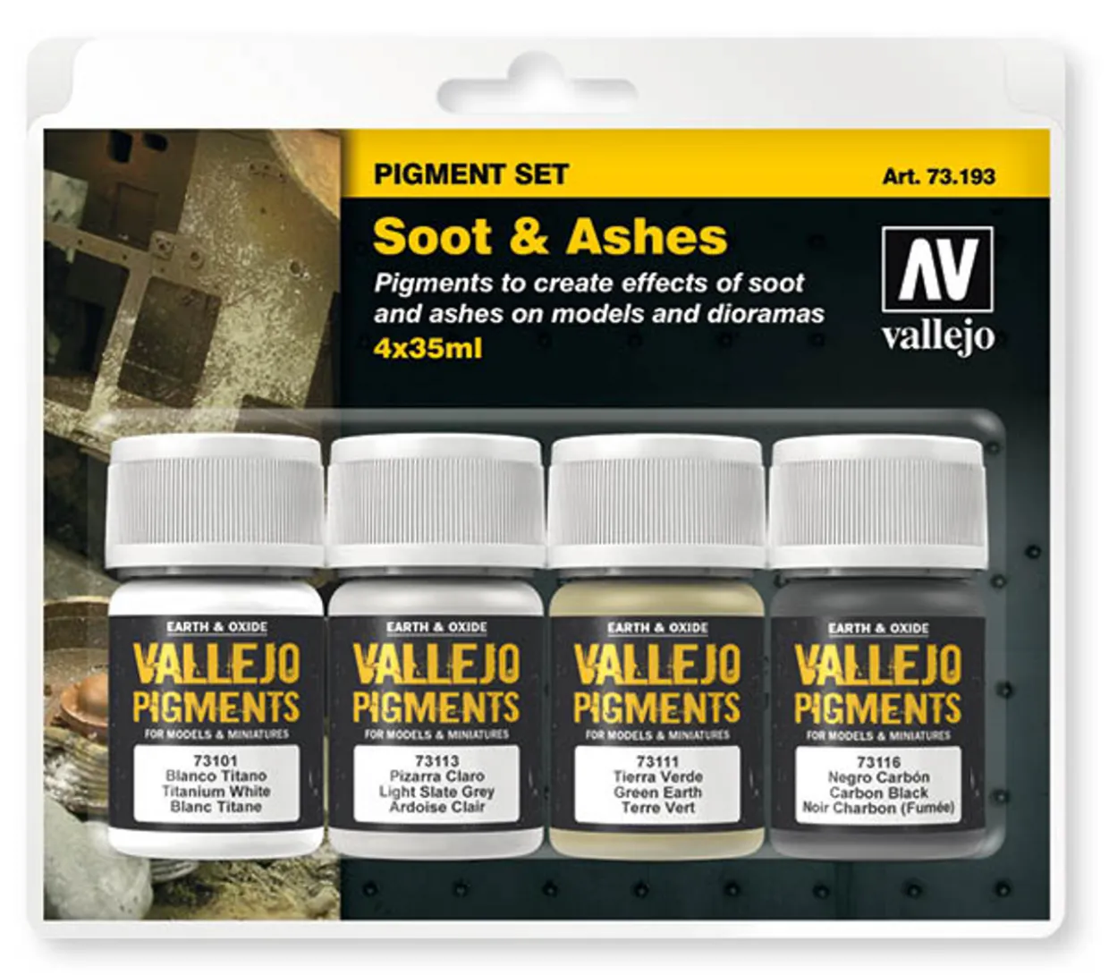 The Vallejo Pigments Set – Soot & Ashes includes a step by step guide by Chema Cabrero to assist in creating the effects of Soot & Ashes on models and dioramas and includes 4 x 35ml pigments.