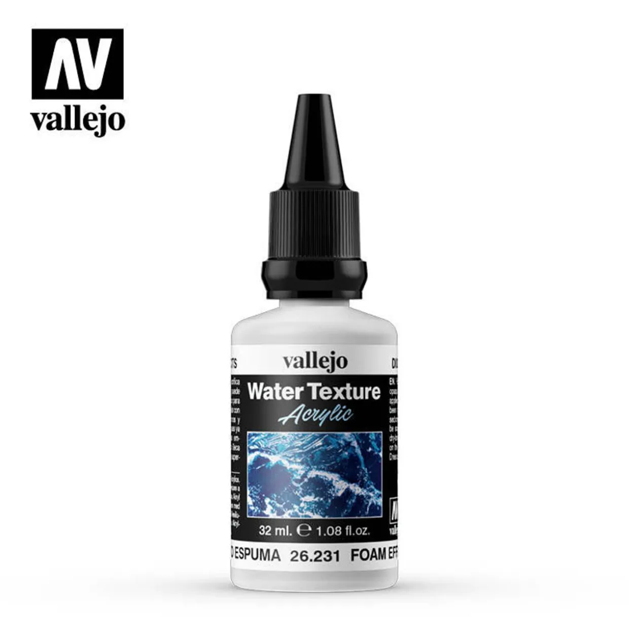 Vallejo Water Effects – Foam and Snow 32ml is a heavy, extra opaque white acrylic, which can be applied directly from the bottle, has been formulated for simulating raised crests on waves. The product can be sculpted with a palette knife or dry-brushed to form whirls & wakes on the surface of tinted Water gels. Dries quickly to a hard, white surface.