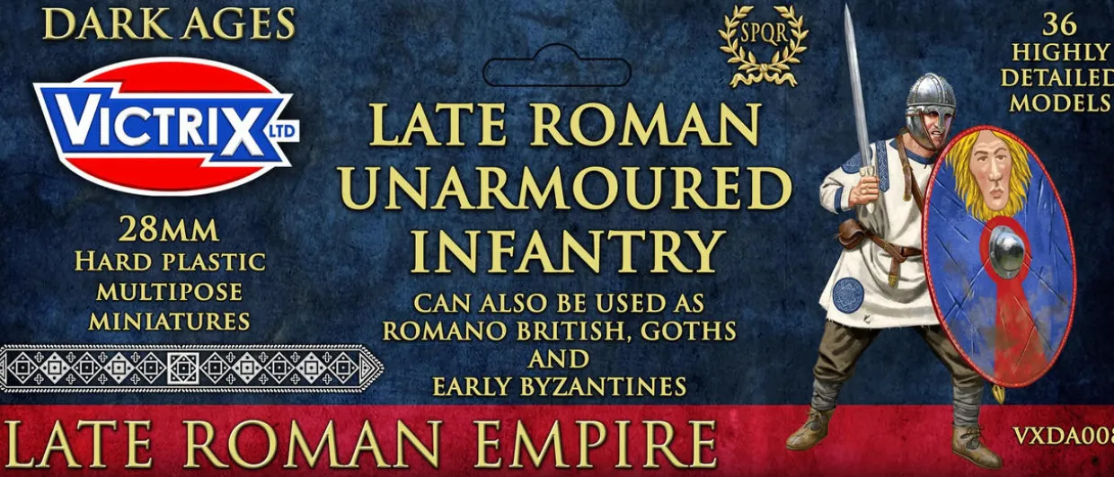 This exceptional 36 figure set of 28mm hard plastic Late Romans has superbly detailed figures and a myriad of additional parts allowing hundreds of options when building the figures. This set is fully supported by a range of shield transfers and banner sheets from LBMS, all available on the Victrix store.This set can also be used as Arthurians, Early Byzantines and Goths/Germanic.Coming soon to this Late Roman range: Armoured infantry, Archers/Slingers, Heavy Cavalry, Light Cavalry, Horse Archers and Cataphracts..Whats in the box?