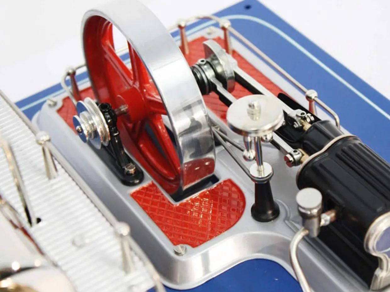 Double action reversible brass cylinder with flywheel, spring loaded safety valve, additional steam whistle with chain, pressure gauge, steam regulator, flywheel of 3.9″ diameter with grooved pulley, sturdy attractive die cast piston rods, centrifugal governor, steam jet oiler and railing.