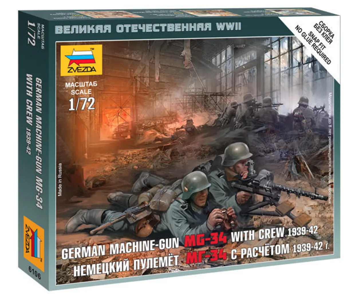 The Zvezda 1/72 German MG Crew Eastern Front from our 1/72 and 1/76 scale figure model kits range accurately recreates the real-life German soldiers from World War II. This plastic model kit requires paint, and may require glue, to complete.